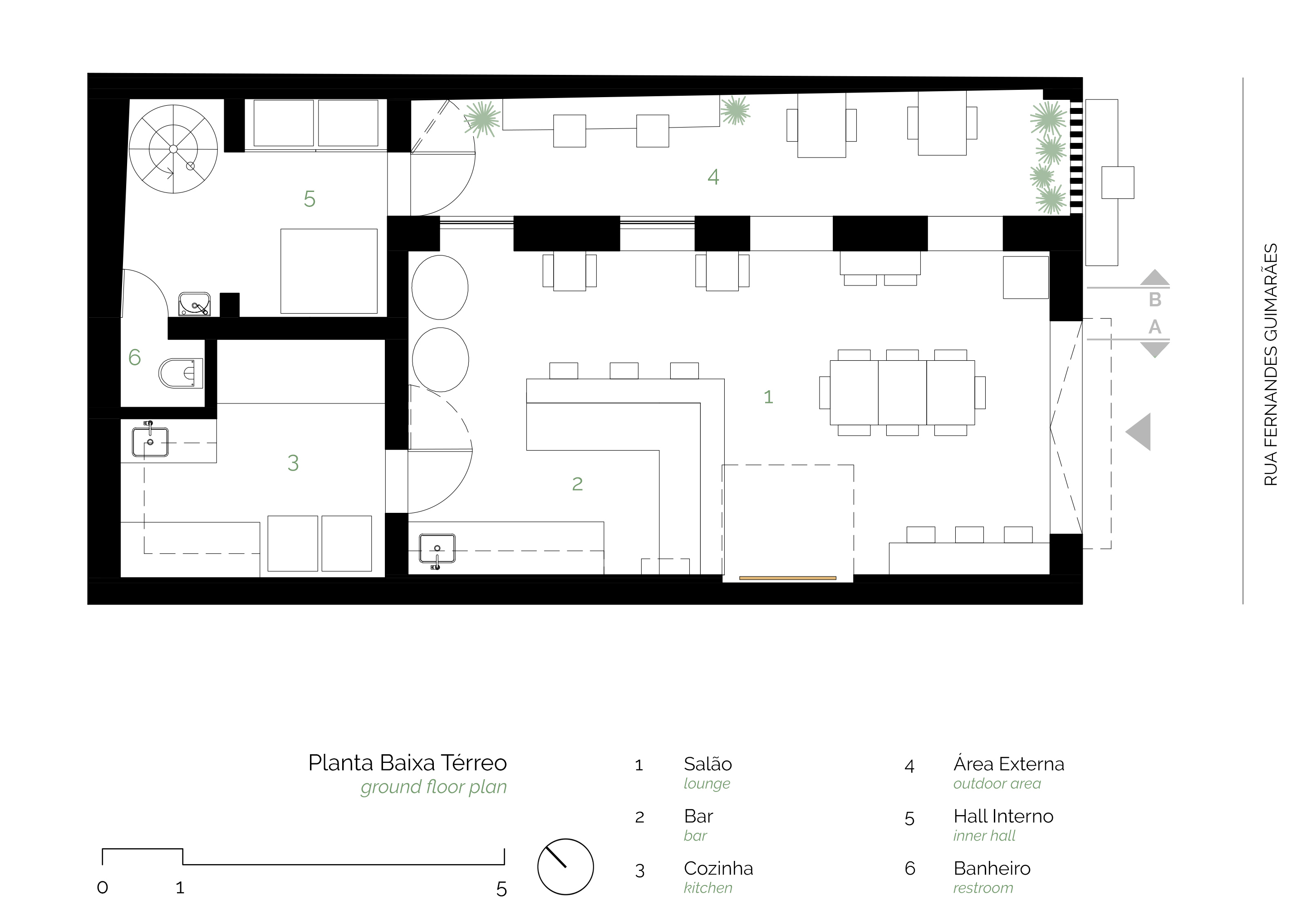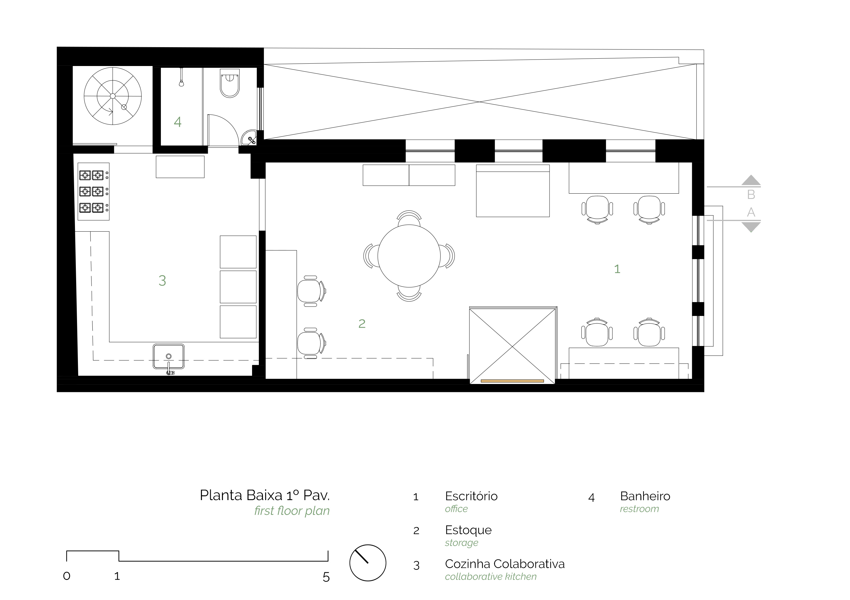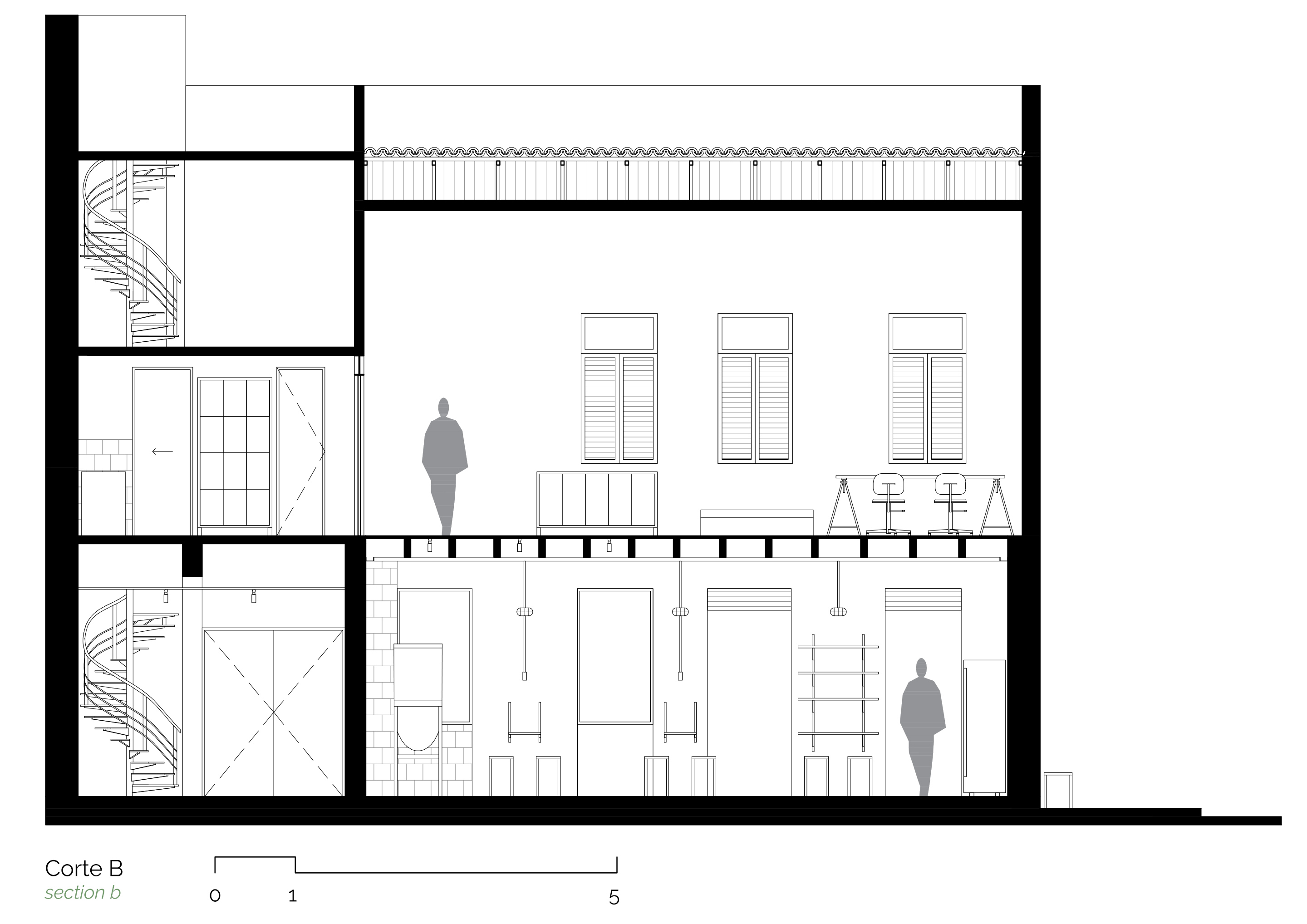 O sobrado possui três pavimentos, que somam 140m², e teve seu programa distribuído da seguinte forma: no térreo, o atendimento ao público, com salão e bar; no primeiro pavimento, as atividades mais privadas, como a cozinha colaborativa, o estoque/logística e os escritórios; e por fim, no segundo pavimento, a micro-cervejaria artesanal.