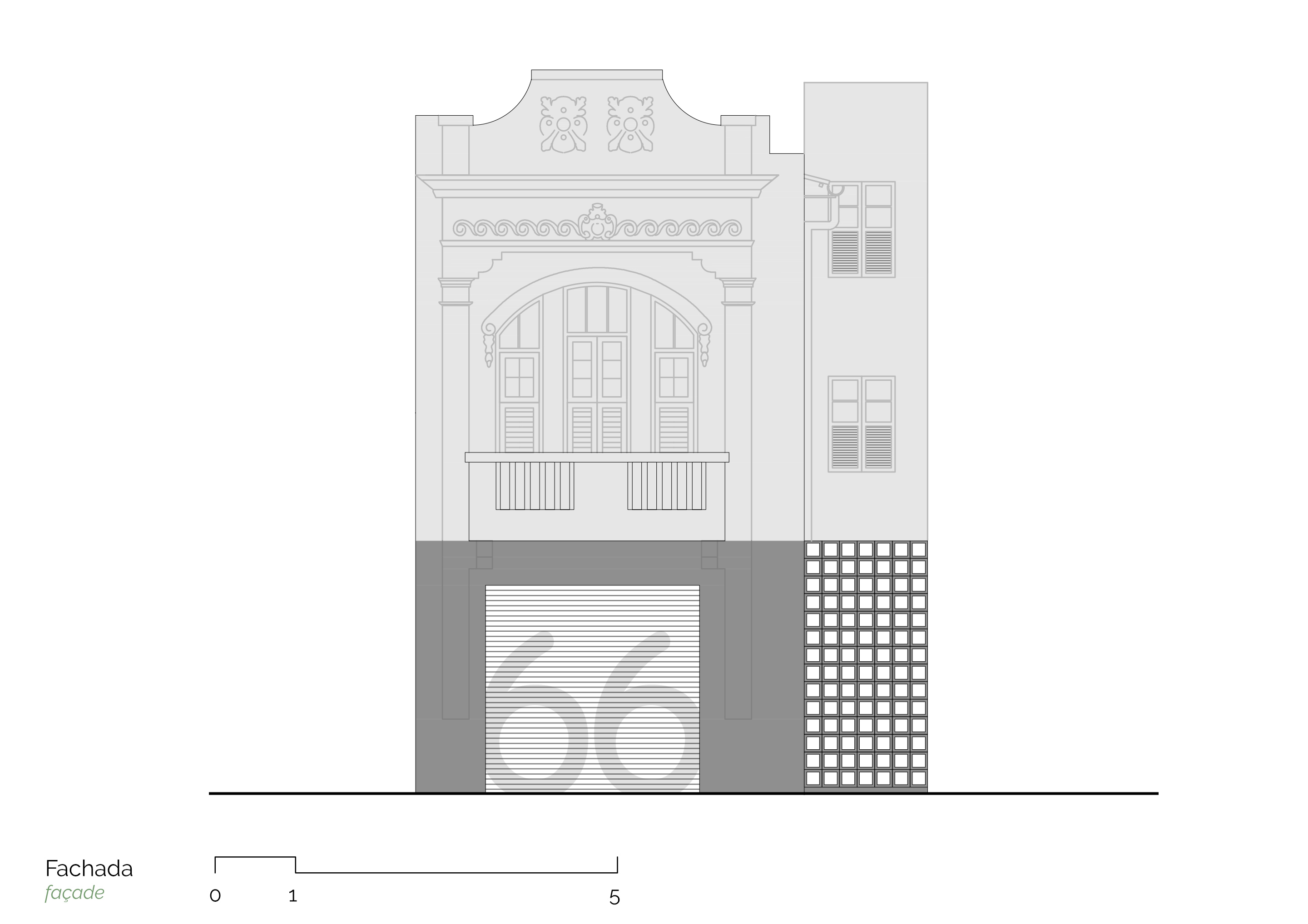 O espaço interno é profundo e estreito, decidimos então manter a entrada principal e demolir os vãos laterais, permitindo uma melhor integração com a área externa, que também dá acesso ao banheiro e à escada que conecta os outros pavimentos. A entrada lateral existente deu lugar a uma parede de blocos de concreto vazados, aumentando a comunicação visual externa/interna e possibilitando uma melhor disposição do mobiliário. Na fachada, a pintura azul royal ganhou nova roupagem, agora metade cinza, metade branca.