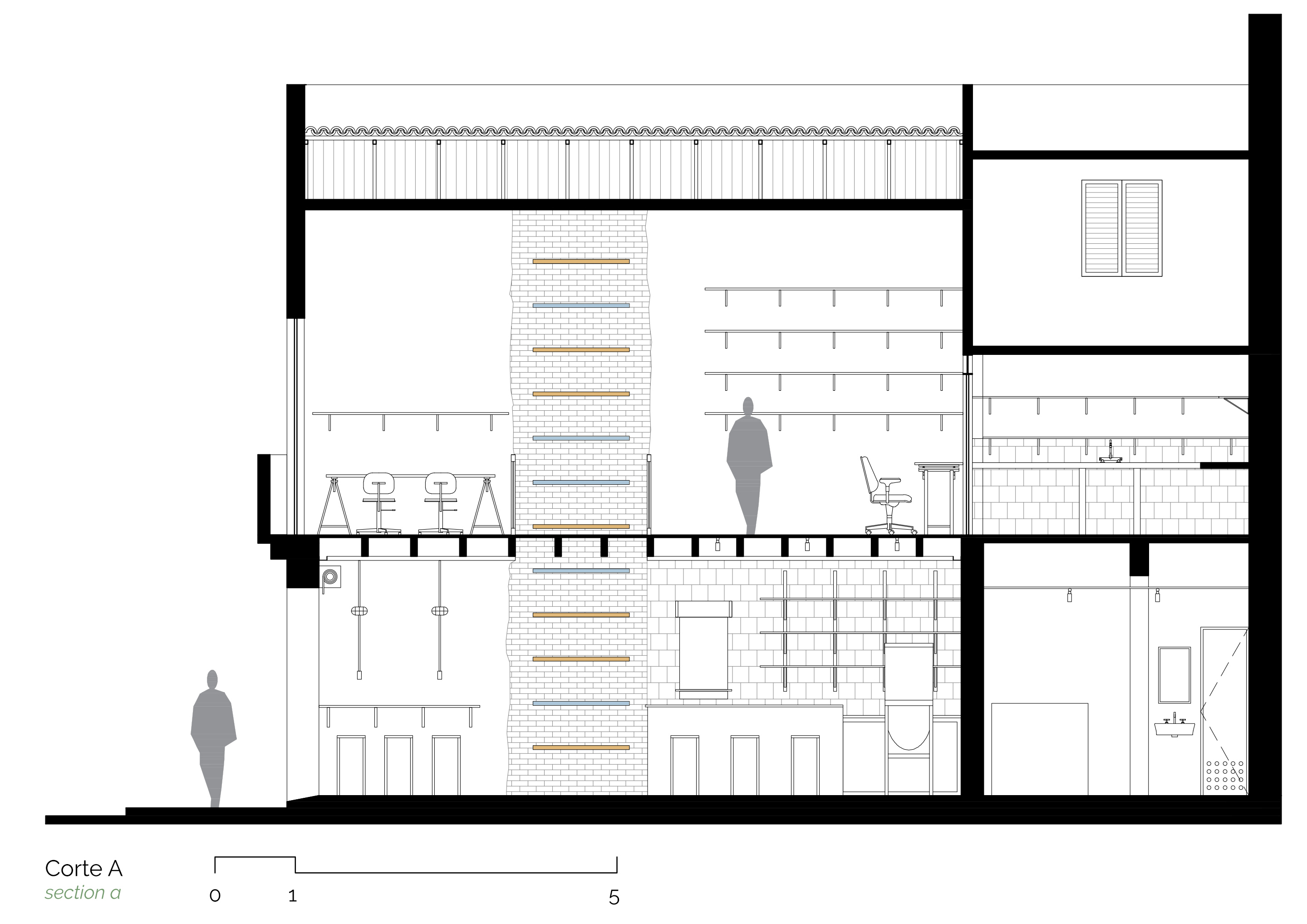O sobrado possui três pavimentos, que somam 140m², e teve seu programa distribuído da seguinte forma: no térreo, o atendimento ao público, com salão e bar; no primeiro pavimento, as atividades mais privadas, como a cozinha colaborativa, o estoque/logística e os escritórios; e por fim, no segundo pavimento, a micro-cervejaria artesanal.
